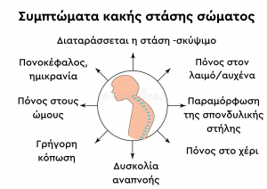 Από την κακή στάση του σώματος, όταν καθόμαστε ή στεκόμαστε, μπορούν να εμφανιστούν ξαφνικά διάφορες επώδυνες καταστάσεις λόγω της πίεσης ή της καταπόνησης στη σπονδυλική μας στήλη, στους μύες, στις αρθρώσεις και στις δομές στήριξης του σώματος. Αποτέλεσμα της κακής στάσης των σώματος είναι οι γερμένοι ώμοι, η κλίση του κεφαλιού προς τα εμπρός, το καμπούριασμα, η υπερένταση των μυών και ο πόνος στο επάνω και κάτω μέρος της πλάτης.