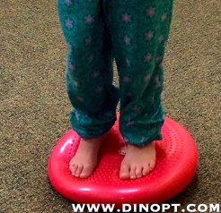 Βάλτε το παιδάκι σας σ’έναν φουσκωτό δίσκο ισορροπίας και πείτε του να διατηρήσει την ισορροπία του για όσο διάστημα θα του πετάτε μια μικρή μπάλα. Μπορείτε ακόμη να του ζητήσετε να κάνει το παιχνίδι του πελαργού ισορροπώντας εναλλάξ στο ένα πόδι. Αυτή η άσκηση βοηθά στην ενδυνάμωση κι ευθυγράμμιση των κάτω άκρων.